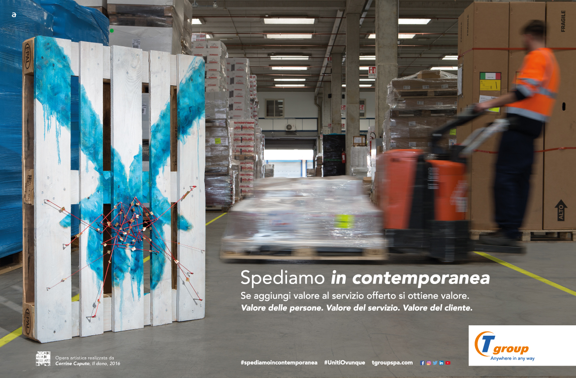 Evidenziare in maniera originale la crescente apertura di snodi nazionali e rilevare il considerevole sviluppo aziendale. Promuovere il valore che Tgroup offre al cliente dando valore al servizio che offre. Qual è la maniera migliore per valorizzare l’eccezionale servizio di trasporto pallettizzato di Tgroup? Trasformare dei “semplici bancali” in opere artistiche contemporanee. Trattare i pallet, supporto su cui viene caricata la merce dei propri clienti, come fossero la merce stessa. Quindi un oggetto prezioso.